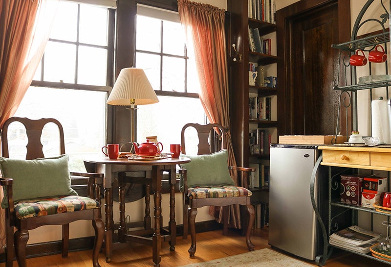 Our Coffee Room in the main house of the bed and breakfast is stocked with a Keurig coffeemaker and plenty of choices of roasts, hot chocolate, and teas to choose whenever you are in need. Morning begins with the scent of Graffeo’s Dark Italian Roast coffee brewing in the kitchen.Â